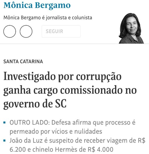 O governo Jorginho Mello (PL) mais uma vez permitiu que a Celesc se tornasse notícia negativa na mídia. Dessa vez, até no cenário nacional. A colunista Mônica Bergamo, da Folha de São Paulo, deu destaque em sua coluna des­sa segunda-feira, 16 de março, para o fato de que Jorginho abrigou na companhia, em cargo comissionado com salário mensal de R$ 22 mil, o ex-Secretário Municipal de Floria­nópolis João da Luz, que está sendo investigado pelo Mi­nistério Público de Santa Catarina (MP-SC) por “favorecer um suposto esquema de cartel no setor funerário e receber presentes de luxo e viagens” – informações retiradas da co­luna de Bergamo.
